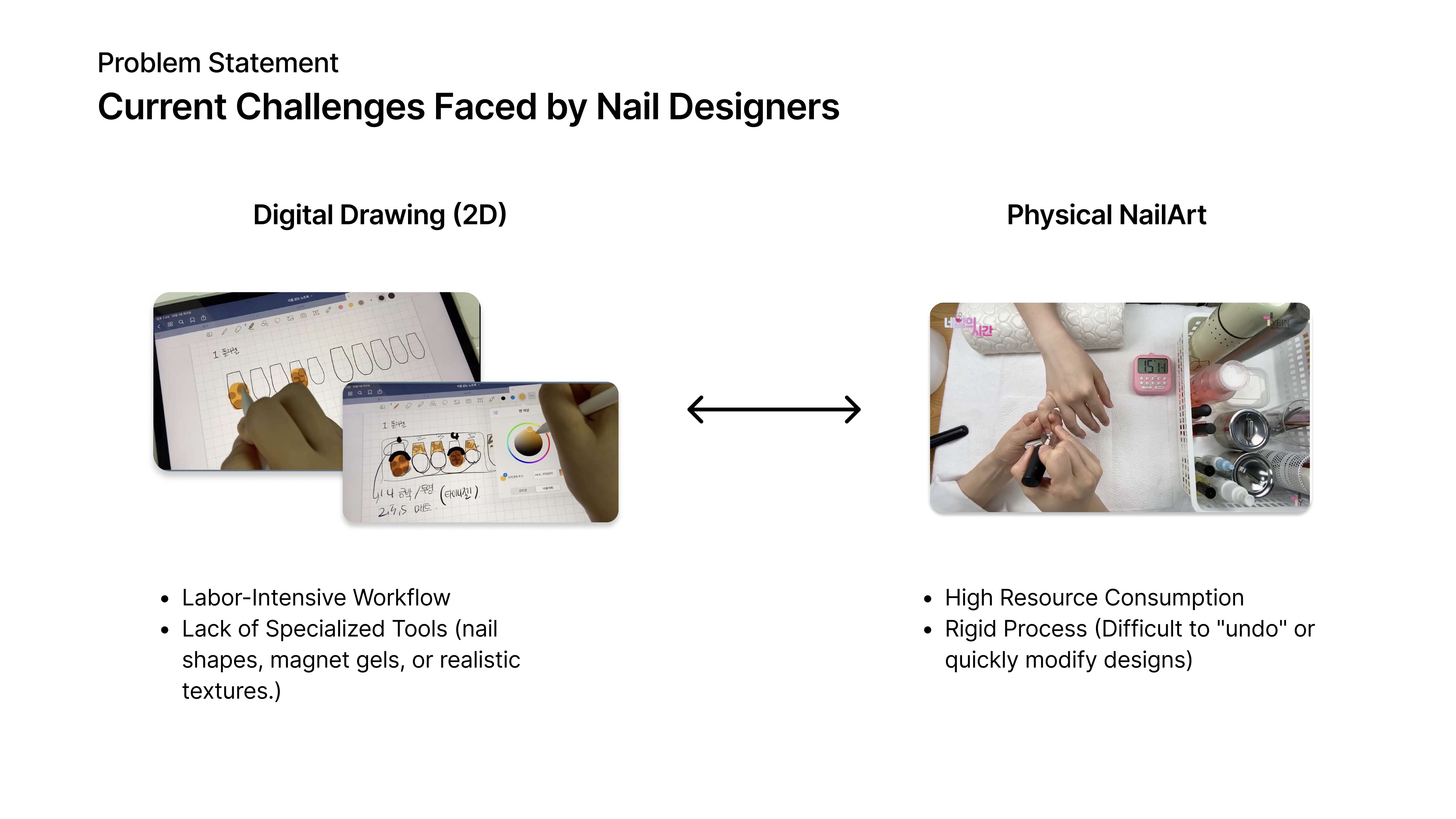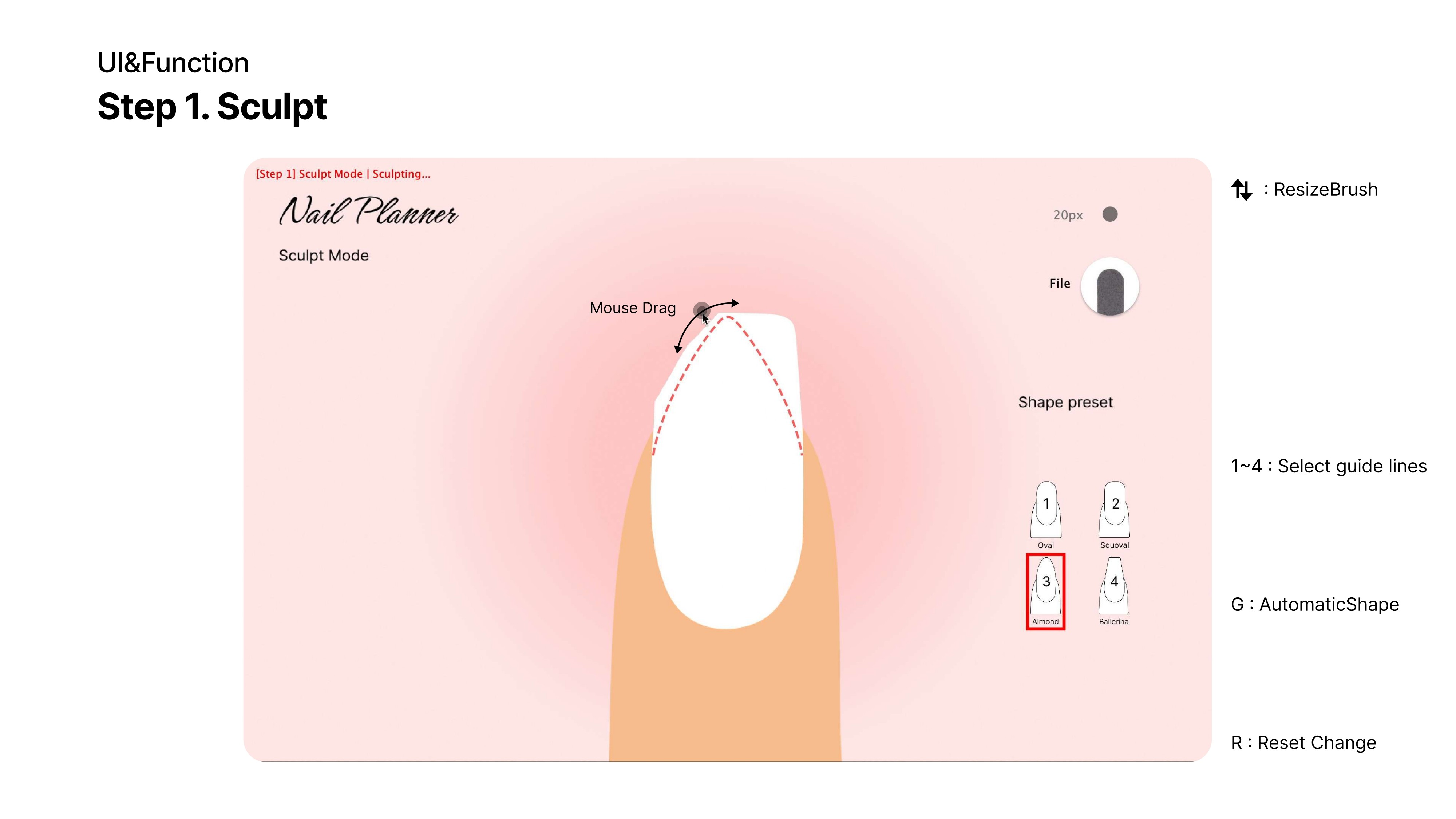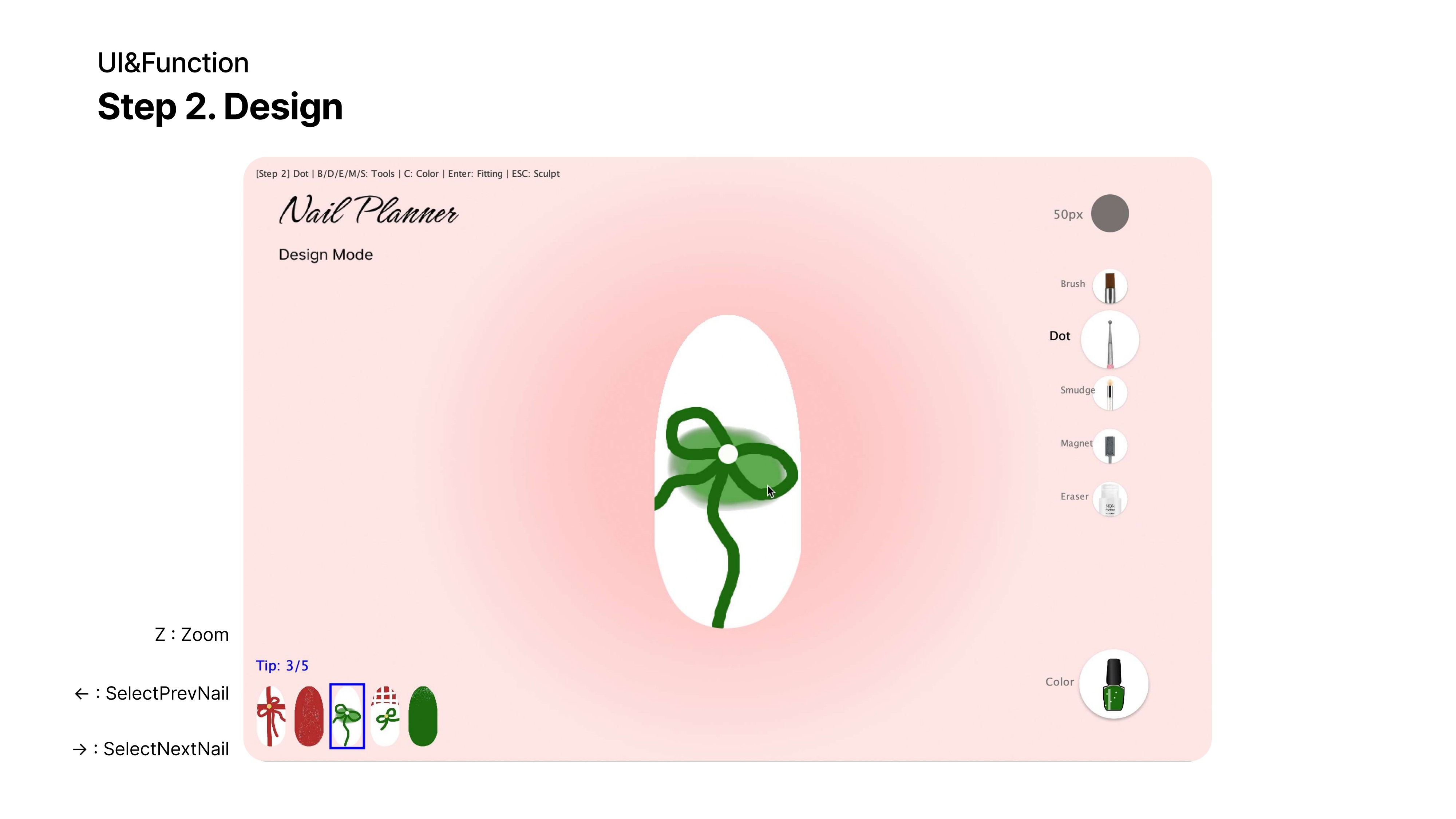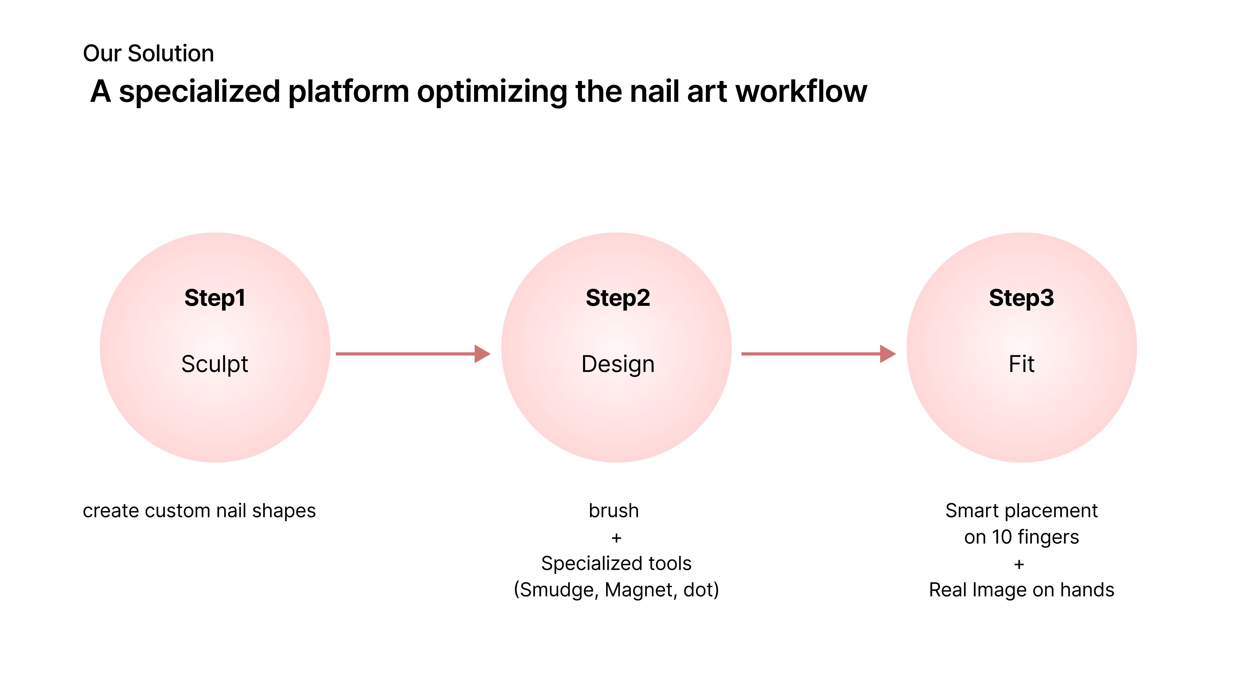 A Java-based nail design tool that replaces generic drawing apps with a specialized workflow for nail creation. Built around sculpting, material-based design, and full-hand preview.